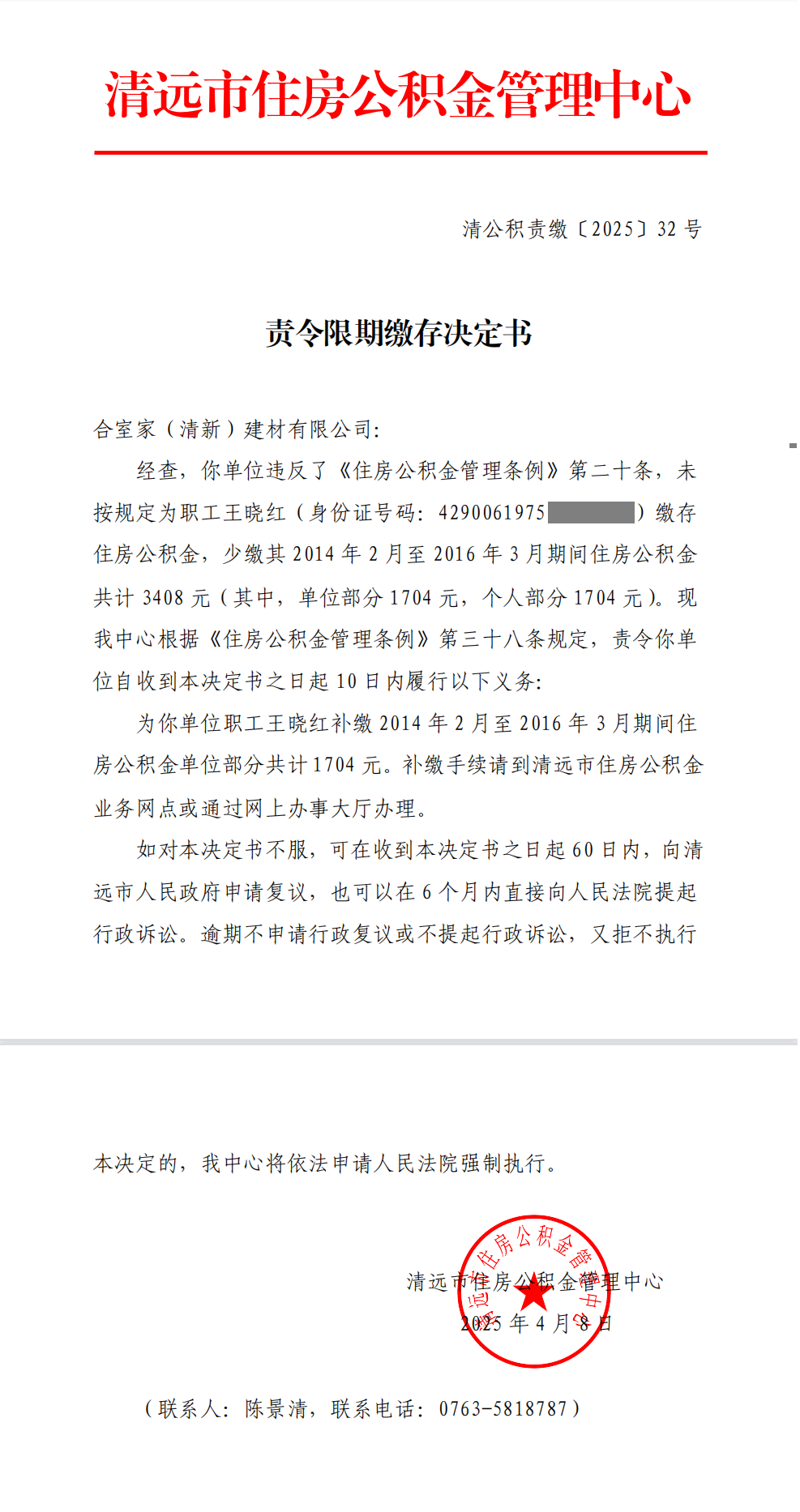 我中心依法受理職工王曉紅投訴你單位未按規(guī)定繳存住房公積金一案已核查完畢,現(xiàn)我中心根據(jù)《住房公積金管理條例》第三十八條規(guī)定,責令你單位自收到本決定書之日起10日內履行以下義務:為你單位職工王曉紅補繳2014年2月至2016年3月期間住房公積金單位部分共計1704元。補繳手續(xù)請到清遠市住房公積金業(yè)務網點或通過網上辦事大廳辦理。因你單位下落不明/以其他送達方式均無法送達,現(xiàn)我中心依法向你單位公告送達《責令限期繳存決定書》(清公積責繳〔2025〕32號),詳見附件。