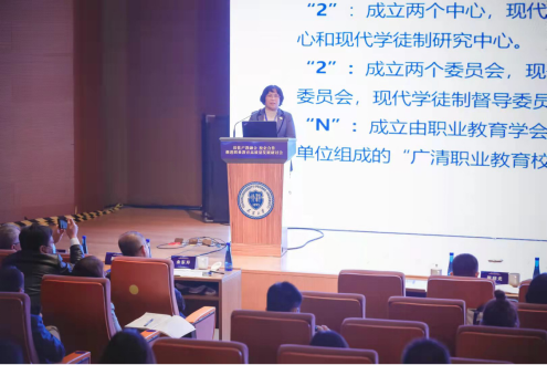 清遠市人民政府委托市委教育工委書記、市教育局黨組書記、局長,二級巡視員張玉蘭出席本次活動,并作“中國特色學徒制的區(qū)域政策與實踐探索”專題報告。張玉蘭從學徒制試點實施背景、政府推動的主要舉措、學徒制政策制度研究、取得成效與工作展望等四個方面系統(tǒng)介紹清遠市在推進現(xiàn)代學徒制試點工作的經(jīng)驗做法。