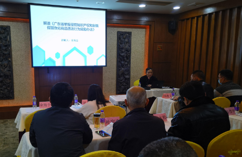 市市場監(jiān)管局執(zhí)法監(jiān)督科科長余海全在培訓(xùn)班上解讀《廣東省舉報(bào)侵犯知識產(chǎn)權(quán)和制售假冒偽劣商品違法行為獎勵辦法》。