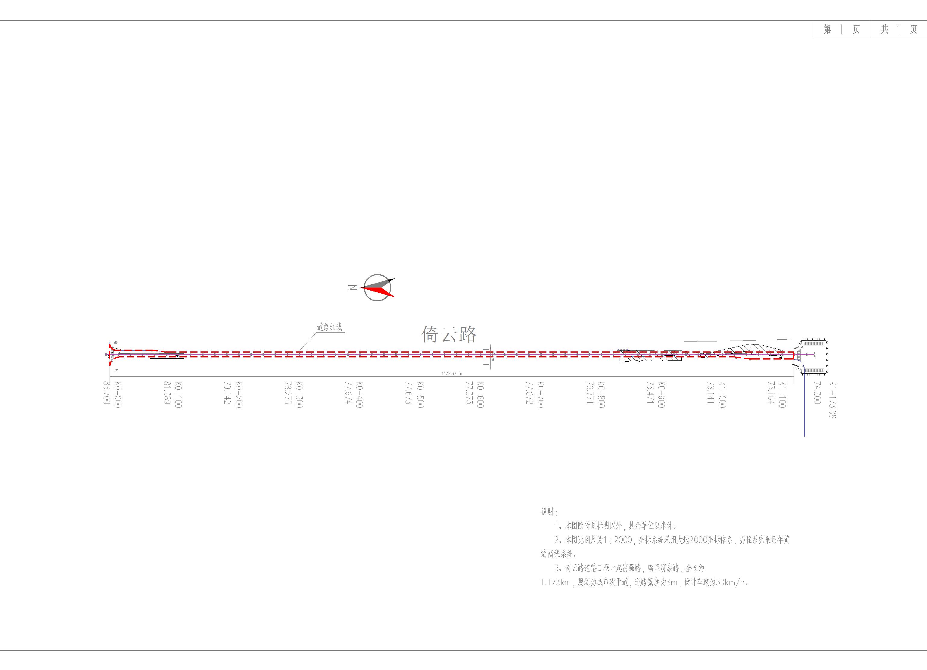 項(xiàng)目概況: 已批出倚云路道路工程設(shè)計(jì)方案,為城市次干路,道路工程北起富強(qiáng)路(標(biāo)高83.7米),南至富康路(標(biāo)高74.3米),設(shè)計(jì)時(shí)速30KM/H,本項(xiàng)目總長(zhǎng)度1173米,道路紅線寬度8米(局部展寬11米),道路橫斷面為:車行道4米+車行道4米。