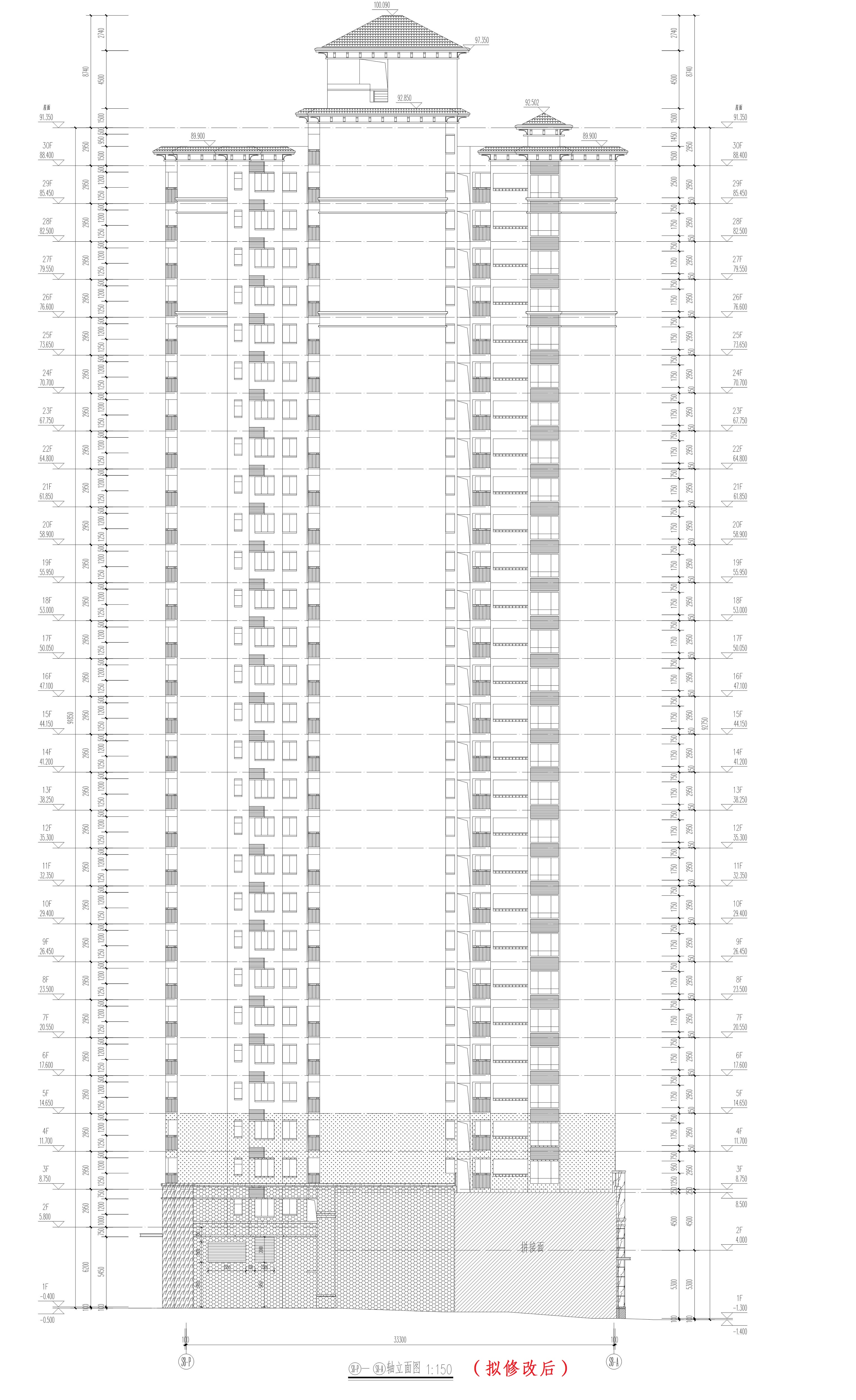報(bào)來方案修改,主要修改內(nèi)容為:1.首二、層立面石材、商鋪布局、裝飾柱位、腰線調(diào)整;2.屋面層調(diào)整合用前室窗尺寸及梯間、機(jī)房立面調(diào)整;具體詳見修改前后附圖。
