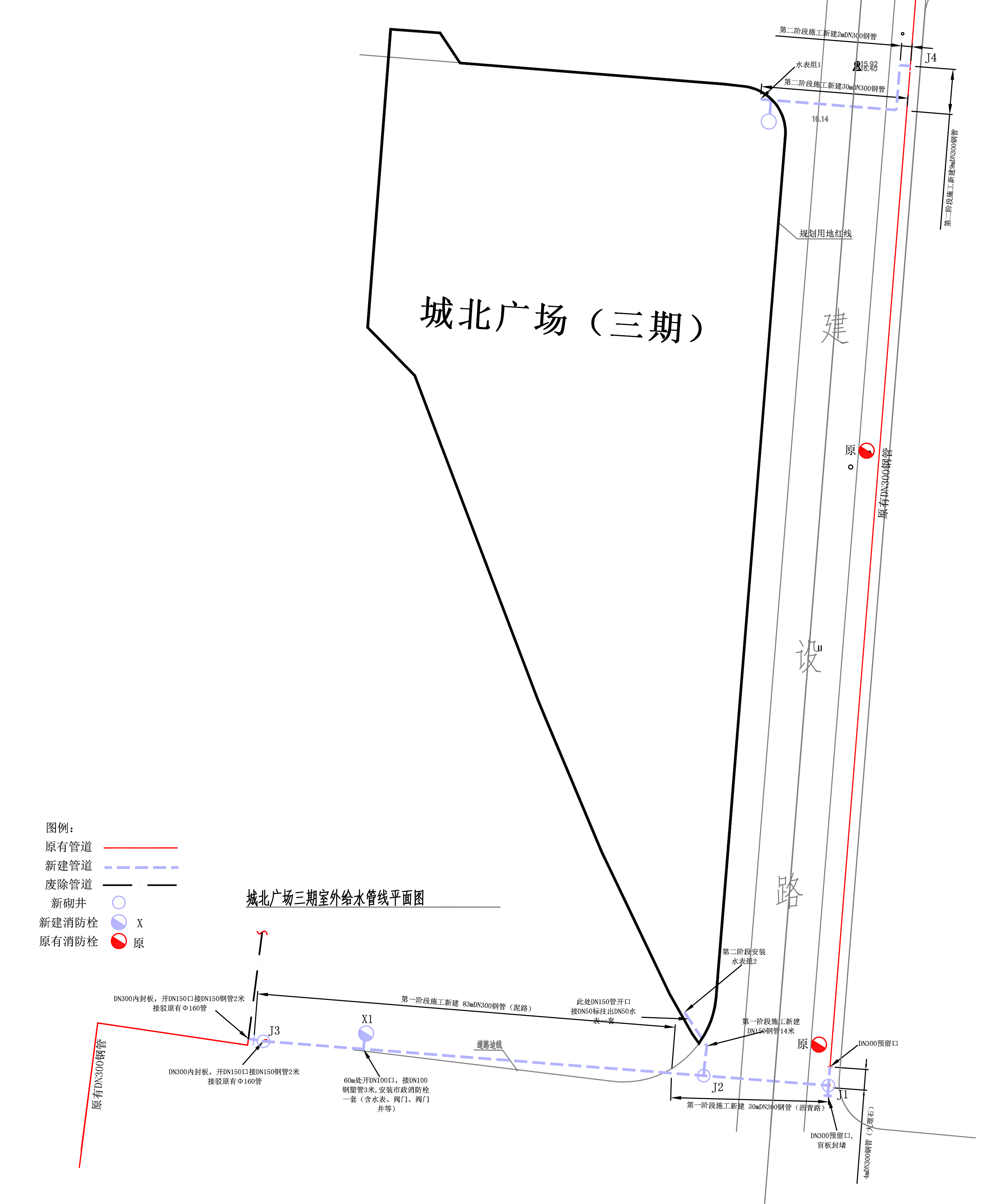 一、本項目由清遠(yuǎn)新世紀(jì)地產(chǎn)開發(fā)有限公司報來清遠(yuǎn)新世紀(jì)地產(chǎn)開發(fā)有限公司(城北廣場三期)供水工程,位于清遠(yuǎn)市清新區(qū)太和鎮(zhèn)縣城三十一號區(qū)。 二、報來清遠(yuǎn)新世紀(jì)地產(chǎn)開發(fā)有限公司(城北廣場三期)供水工程管線總長度172米,其中DN300給水管線長度158米,DN100給水管線長度14米,由現(xiàn)有的市政給水管DN300管接入。敷設(shè)方式為直埋。設(shè)計方案詳見附圖。