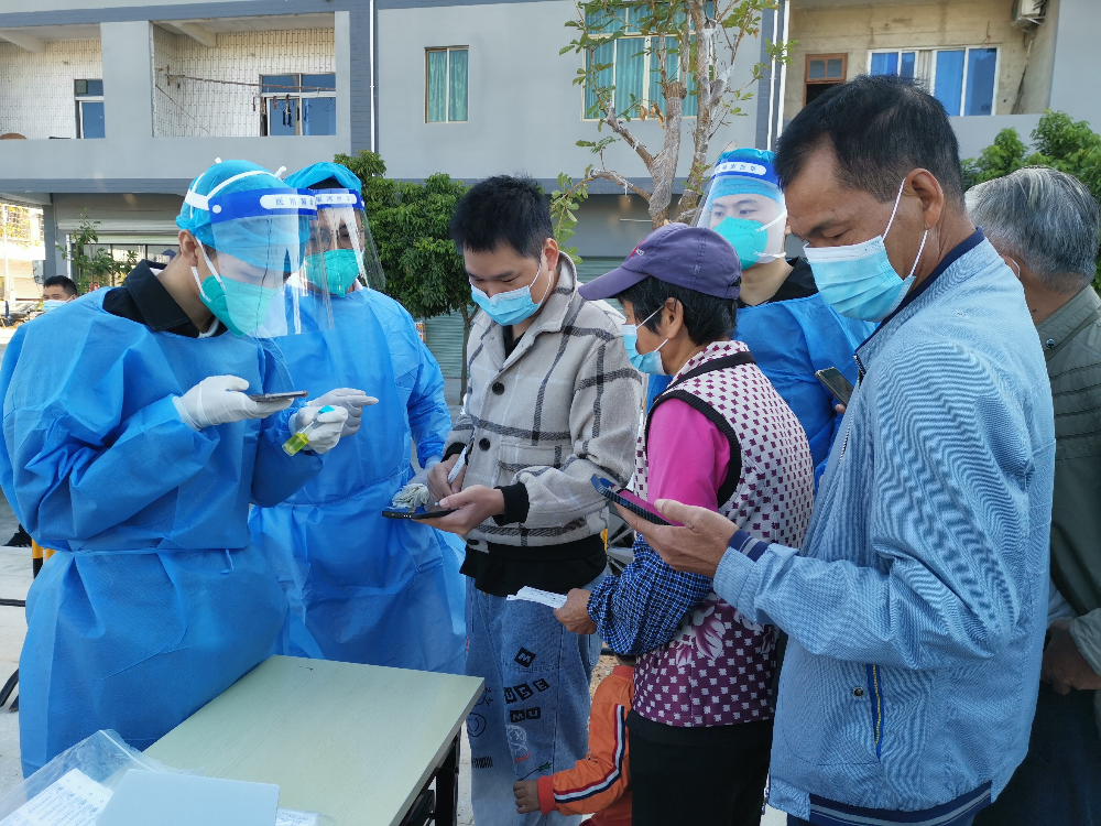 圖為市審計局黨團志愿服務(wù)隊在橫石花壇點位幫助飛來峽鎮(zhèn)居民掃碼登記、做好全員核酸檢測