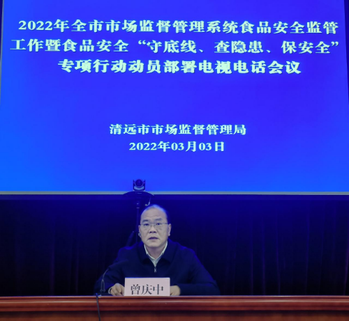 為深入學(xué)習(xí)貫徹習(xí)近平總書記關(guān)于食品安全的重要論述,全面落實(shí)全省食品安全監(jiān)管工作電視電話會議精神,2022年3月3日,清遠(yuǎn)市市場監(jiān)督管理局組織召開2022年全市市場監(jiān)管系統(tǒng)食品安全監(jiān)管工作暨食品安全“守底線、查隱患、保安全”專項行動動員部署工作會議。市市場監(jiān)管局黨組成員、二級調(diào)研員、市食安辦副主任曾慶中主持會議并作工作報告,市局有關(guān)領(lǐng)導(dǎo),相關(guān)科室負(fù)責(zé)人以及各縣(市、區(qū))市場監(jiān)管局主要領(lǐng)導(dǎo)、分管領(lǐng)導(dǎo),相關(guān)工作人員參加會議。會議以電視電話會議形式開到縣級市場監(jiān)管局。