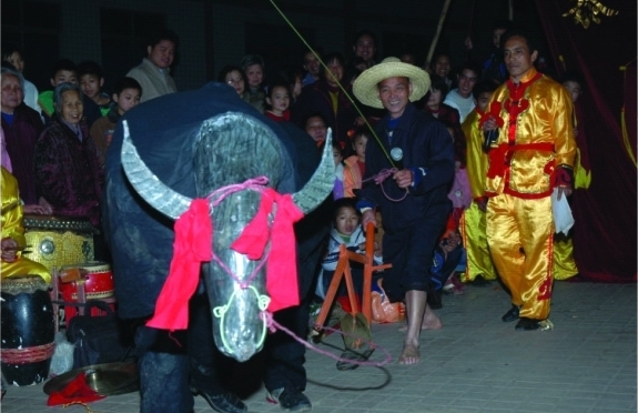 ??? 春牛舞的特點(diǎn)是生活氣息濃厚,動作簡單,多為生活動作以及牛的習(xí)性的模擬,生動自如。表現(xiàn)農(nóng)事活動的場面形象逼真,基本上是實(shí)現(xiàn)生活的再現(xiàn)。演員隨著鑼鼓、音樂的節(jié)奏走“圓場步”、“碎步”和“十字步”,很容易掌握運(yùn)用。每逢春節(jié)至元宵期間,舞牛隊多于白天敲鑼打鼓、舞著春牛到各鄉(xiāng)各村拜年,先在村里的大地坪集中表演,然后到各家各戶拜年賀歲。