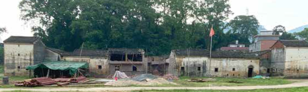城頭圍屋,始建于清代,坐北向南,面闊38.13米,進(jìn)深38.22米,占地面積1457.3平方米。圍屋由祠堂、民房、炮樓組成,四個(gè)角均有1座炮樓。炮樓間有數(shù)間民房相連,構(gòu)成一個(gè)整體,是一座典型的“四點(diǎn)金”圍屋,且具有一定的防御作用。圍屋正門以青磚 砌拱形門框,木門,石門檻。祠堂為三進(jìn)磚木結(jié)構(gòu),面闊4.9米,進(jìn)深27.43米,占地面積134.4平方米。祠堂大門用青磚環(huán)砌,頭廳后有2根圓木漆金柱,石柱礎(chǔ),后設(shè)屏門,上端透花窗,廳后為鵝卵石街。中堂有4根圓木漆金柱,石柱礎(chǔ),明間前設(shè)屏門。后堂有2根圓木漆金柱,石柱礎(chǔ),明間后設(shè)一簡易香案。炮樓平面呈長方形,面闊5.59米,進(jìn)深 6.99米,占地面積39.07平方米,硬山頂,鑊耳封火山墻,木梁瓦面,三合土墻;墻體上設(shè)有花崗巖石一字形槍眼和窗,嵌鐵枝窗棱。炮樓二樓開有小門,上置門檐;墻體厚42厘米,牢固結(jié)實(shí)。圍屋內(nèi)有民房20多間,三合土墻,木梁瓦面。