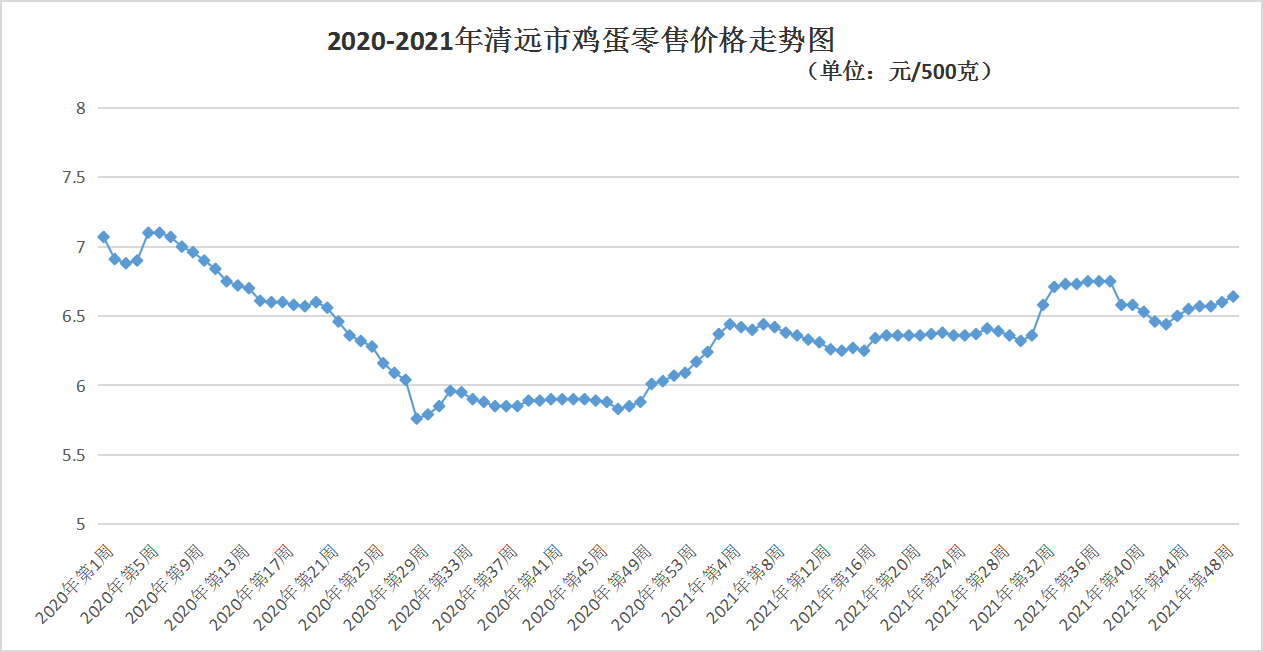 雞蛋價格6.64元/500克,較上周升0.61%;鴨蛋維持8.18元/500克。