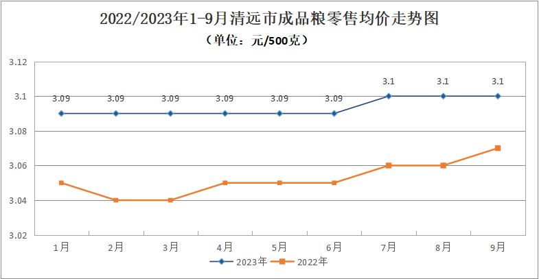 2023年三季度,我市監(jiān)測的6種主要成品糧平均零售價每500克3.1元,環(huán)比(與2023年二季度相比,下同)升0.32%,同比(與2022年三季度相比,下同)升1.31%。其中,晚秈米、絲苗米、珍珠米、油粘米分別為2.87元、3.19元、3.15元、3.33元,環(huán)比升0.35%、0.31%、0.96%、0.3%。
