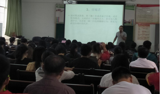 葉老師分別從“校園欺凌的定義”“校園欺凌包括的四個(gè)因素”“欺凌的三種形式”“校園欺凌當(dāng)中的三個(gè)角色”“校園欺凌帶來(lái)的后果”、“對(duì)欺凌者、被欺凌者和旁觀者三者的心理分析”“應(yīng)對(duì)欺凌事件”等方面進(jìn)行了闡述。