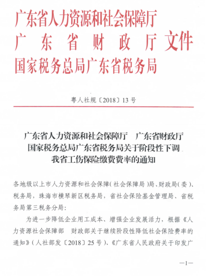 關(guān)于階段性下調(diào)我省工傷保險繳費費率的通知(粵人社規(guī)[2018]13號)