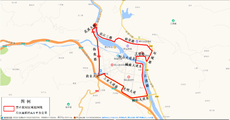 沿江三路-松榮路-環(huán)城路-文塔路-陽(yáng)山大道北-城南大道東-江濱路-陽(yáng)山大道東-光明大道-工業(yè)大道南-商業(yè)大道-韓愈路-花溪大橋-沿江三路所形成的完整閉環(huán)區(qū)域及邊界。