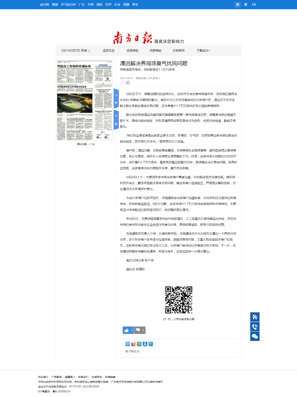 【南方日報】清遠(yuǎn)解決養(yǎng)雞場臭氣擾民問題 拆除違規(guī)養(yǎng)雞場,協(xié)助轉(zhuǎn)移近1.7萬只活雞