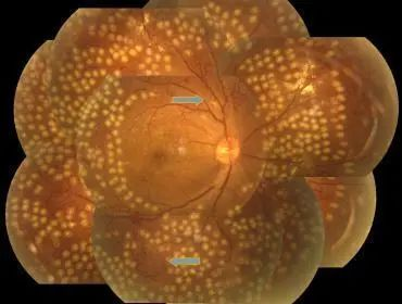 4、眼底熒光血管造影(FFA):如果發(fā)現(xiàn)患者眼底出血滲出,建議患者做熒光血管造影,了解我們?nèi)庋劭床怀鰜淼?,如是否長了新生血管,是否有很多血管都閉塞了,從而選擇治療方案;
