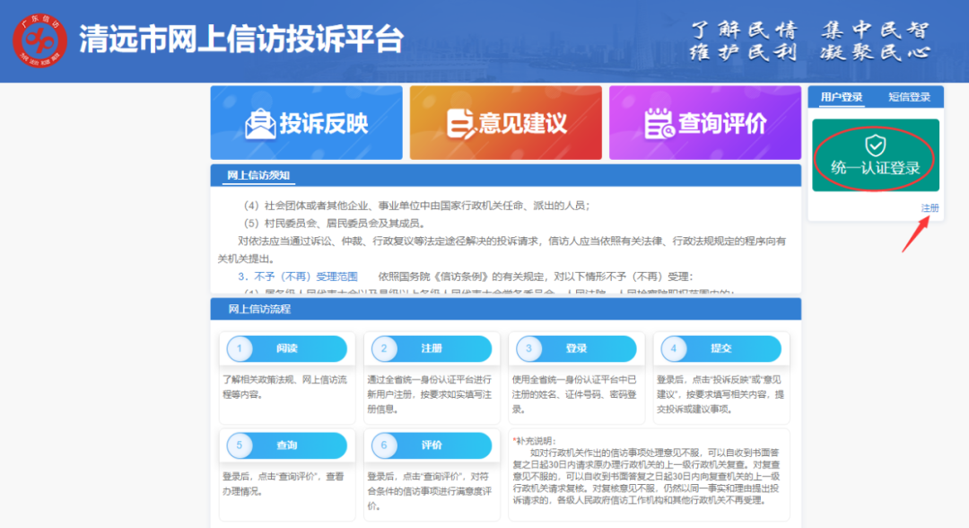 2.進入清遠市網(wǎng)上信訪投訴平臺,通過省統(tǒng)一身份認證平臺完成實名注冊登錄。