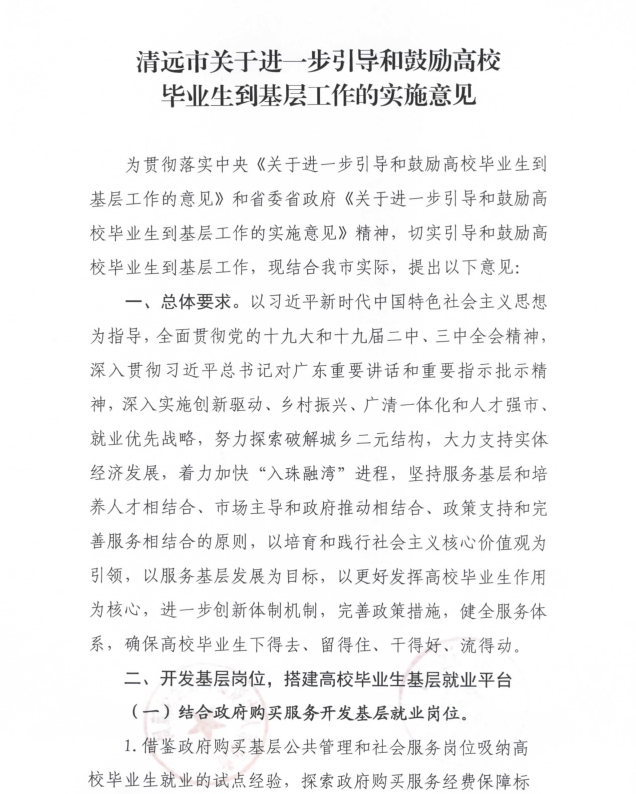 關(guān)于印發(fā)《清遠市關(guān)于進一步引導和鼓勵高校畢業(yè)生到基層工作的實施意見》的通知