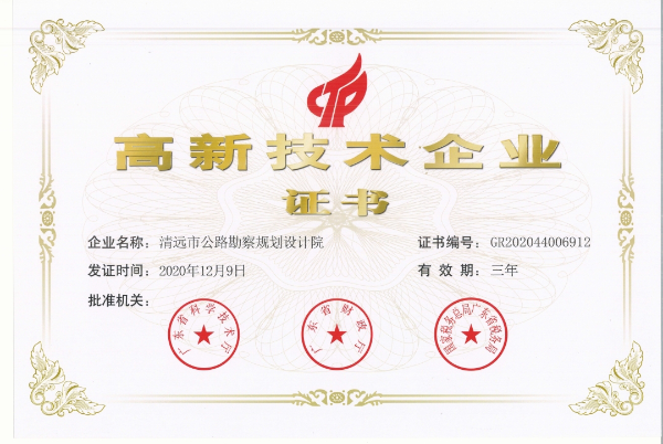 2020年12月9日,清遠(yuǎn)市公路勘察規(guī)劃設(shè)計(jì)院有限公司被評為廣東省高新技術(shù)企業(yè)稱號,并于2021年5月12日正式獲頒證書和牌匾。