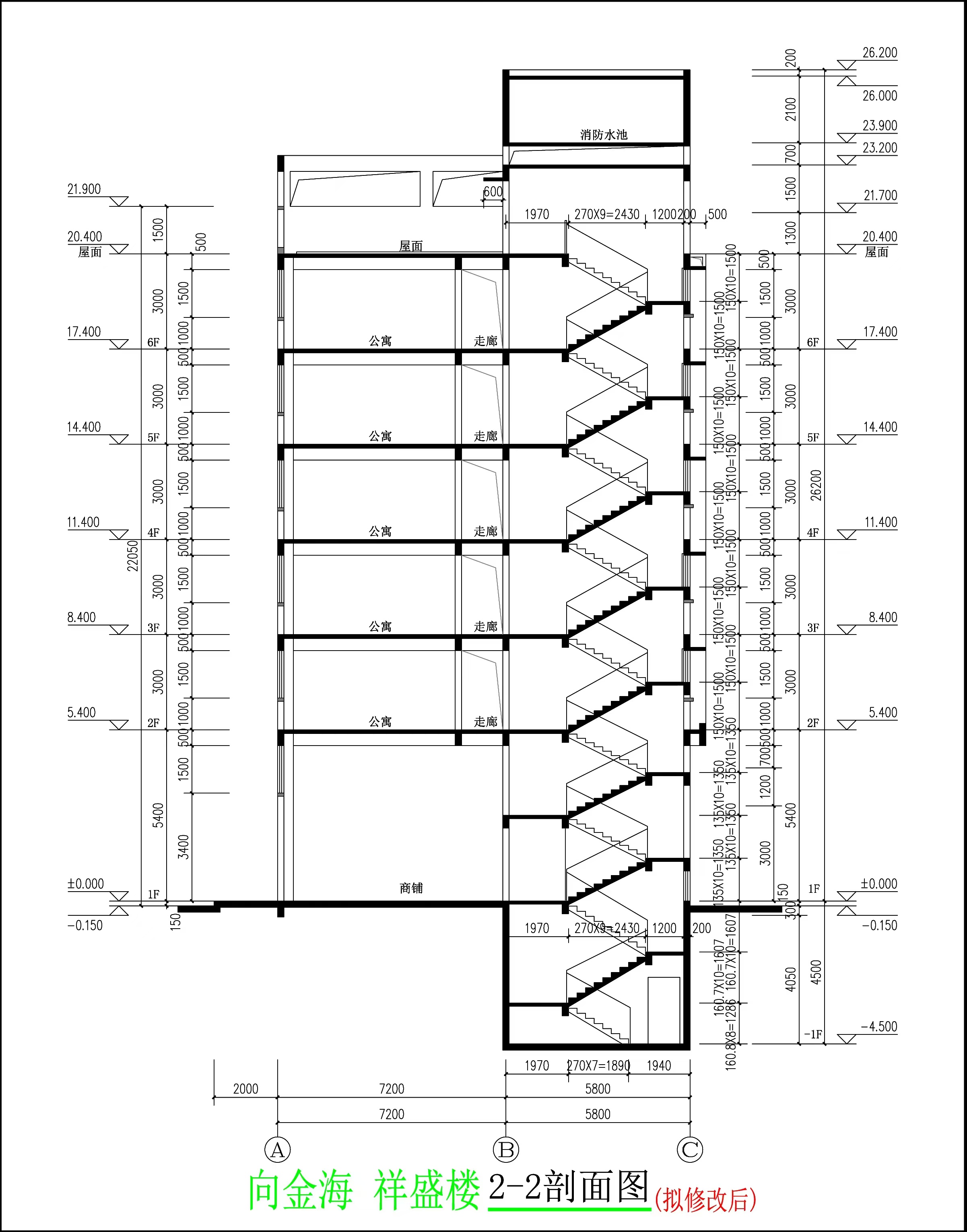 項(xiàng)目概況: 1、負(fù)一層:增加了生活水池及泵房,面積增加了46.02平方米。 2、首層:原1/4-5軸雜物間改為配電間,增加了外開門。原卷閘門改為玻璃門、增加了殘衛(wèi)。增加1/4-5軸門窗,增加了A軸門窗。 3、二至五層:原衛(wèi)生間由外墻位置調(diào)整為中間通道位置 4、六層:原衛(wèi)生間由外墻位置調(diào)整為中間通道位置 5、7-1軸立面:5-4軸首層增加了門窗,5-4軸梯間窗尺寸縮小了。 6、總平面圖地下室面積線修改,指標(biāo)表格相應(yīng)修改。 7、增加2-2剖面圖。 具體詳見附圖。
