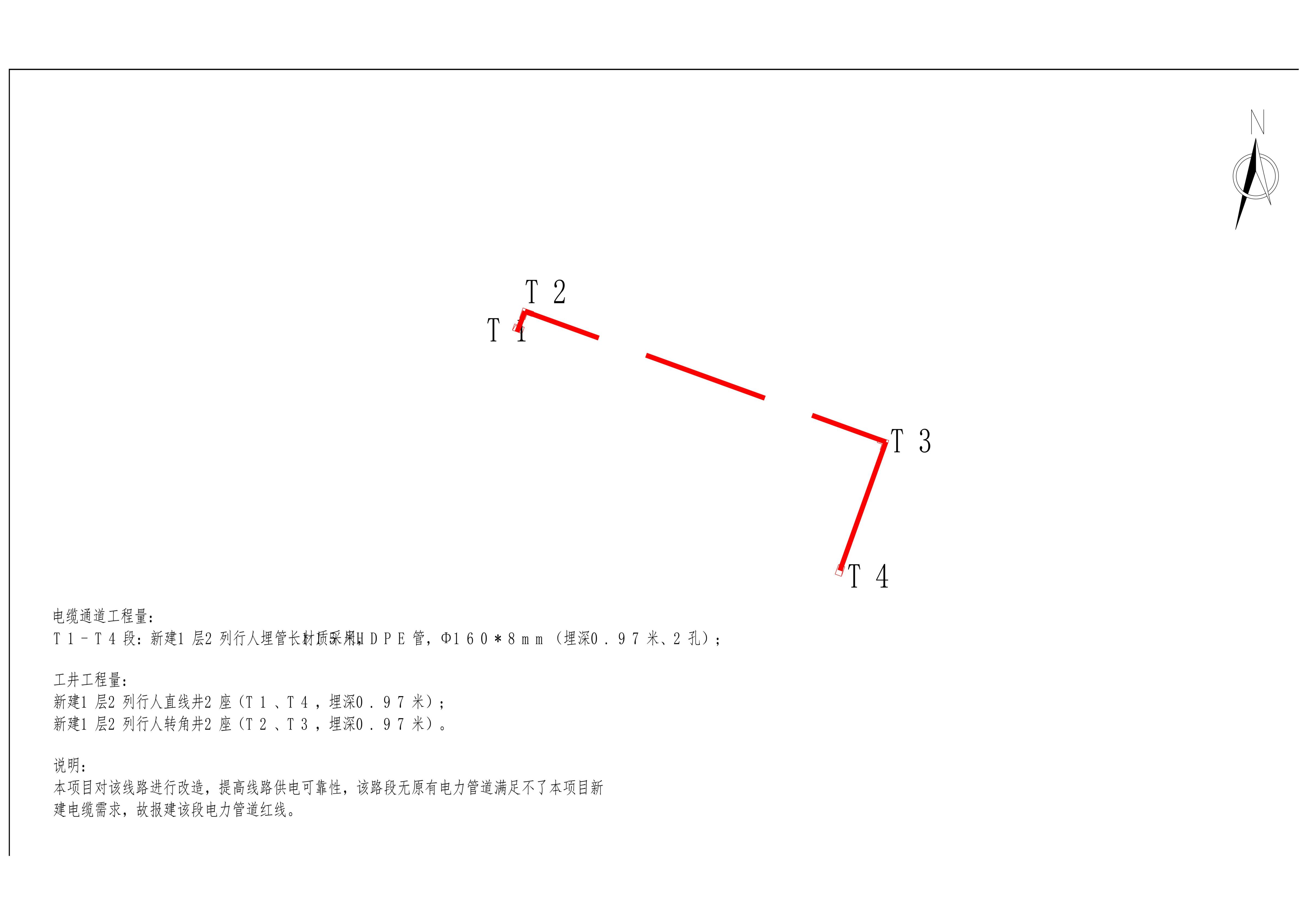 電殘通道工程量:1-4段:新建1層2列行人埋管長(zhǎng)115米,材質(zhì)采用HDPE管,直徑160*8mm(埋深0.97米、2孔)工井工程量:新建1層2列行人直線井2座(T1、T4,埋深0.97米)新建1層2列行人轉(zhuǎn)角井2座(T2、T3,埋深0.97米)。說明:本項(xiàng)目對(duì)該線路進(jìn)行改造,提高線路供電可靠性,路段無原有電力管道満足不了本項(xiàng)目新建電纜需家,款建該段電力管道紅線。詳細(xì)情況見附圖。