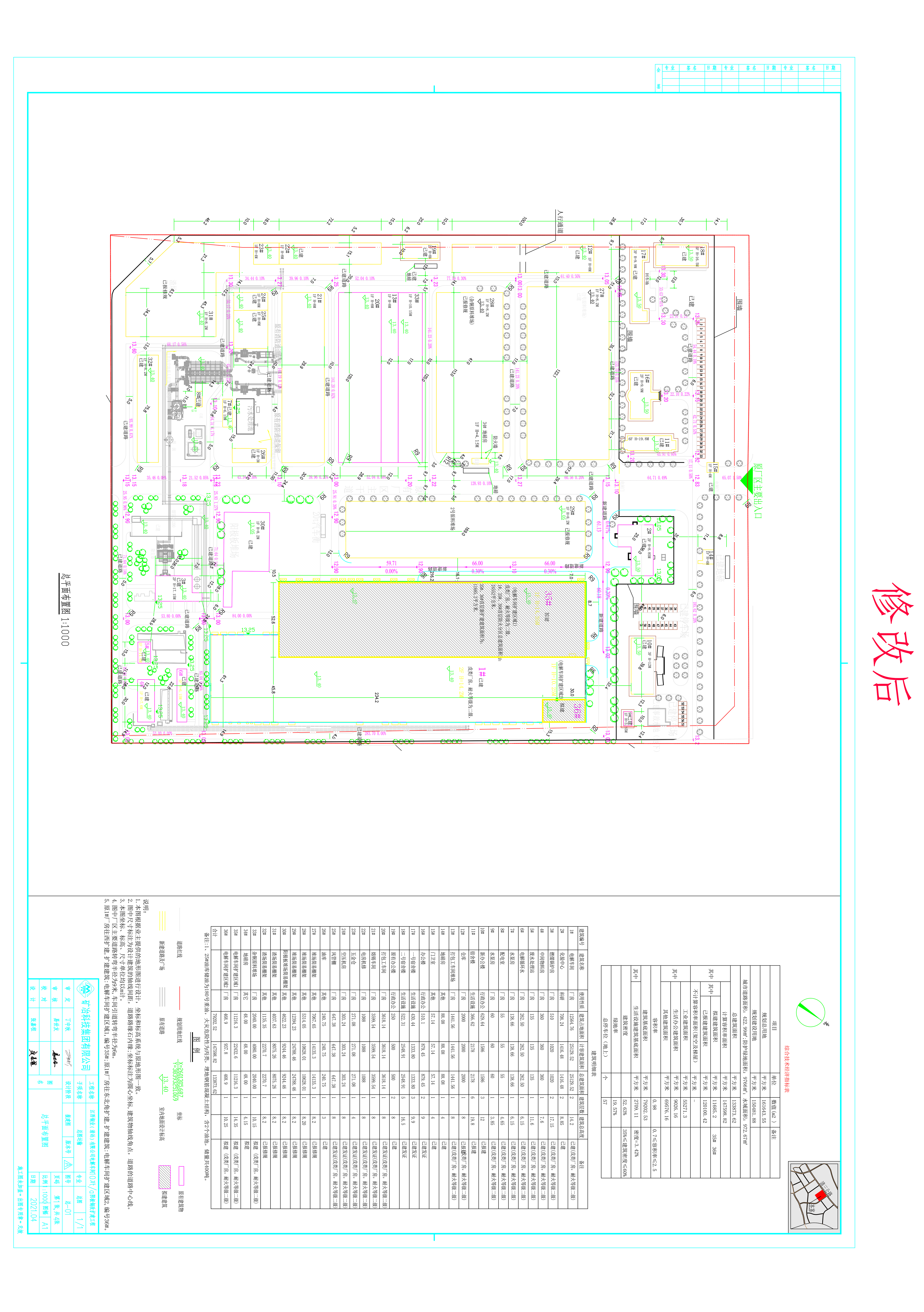 報(bào)來(lái)修改的總平面方案:總用地面積161643.55平方米,其中:規(guī)劃建設(shè)用地面積150481.88平方米,城市道路用地面積為422.99平方米,防護(hù)綠地面積為9766平方米,水域面積為972.67平方米,總建筑面積133873.62平方米,建筑基底面積79202.53平方米,計(jì)容建筑面積147598.82平方米,容積率0.98,建筑密度52.63%,綠地率19.57%,停車位57個(gè);在原批出的方案總建筑面積增加11685.20平方米,總計(jì)容面積增加23370.40平方米,建筑基底面積增加11685.20平方米。