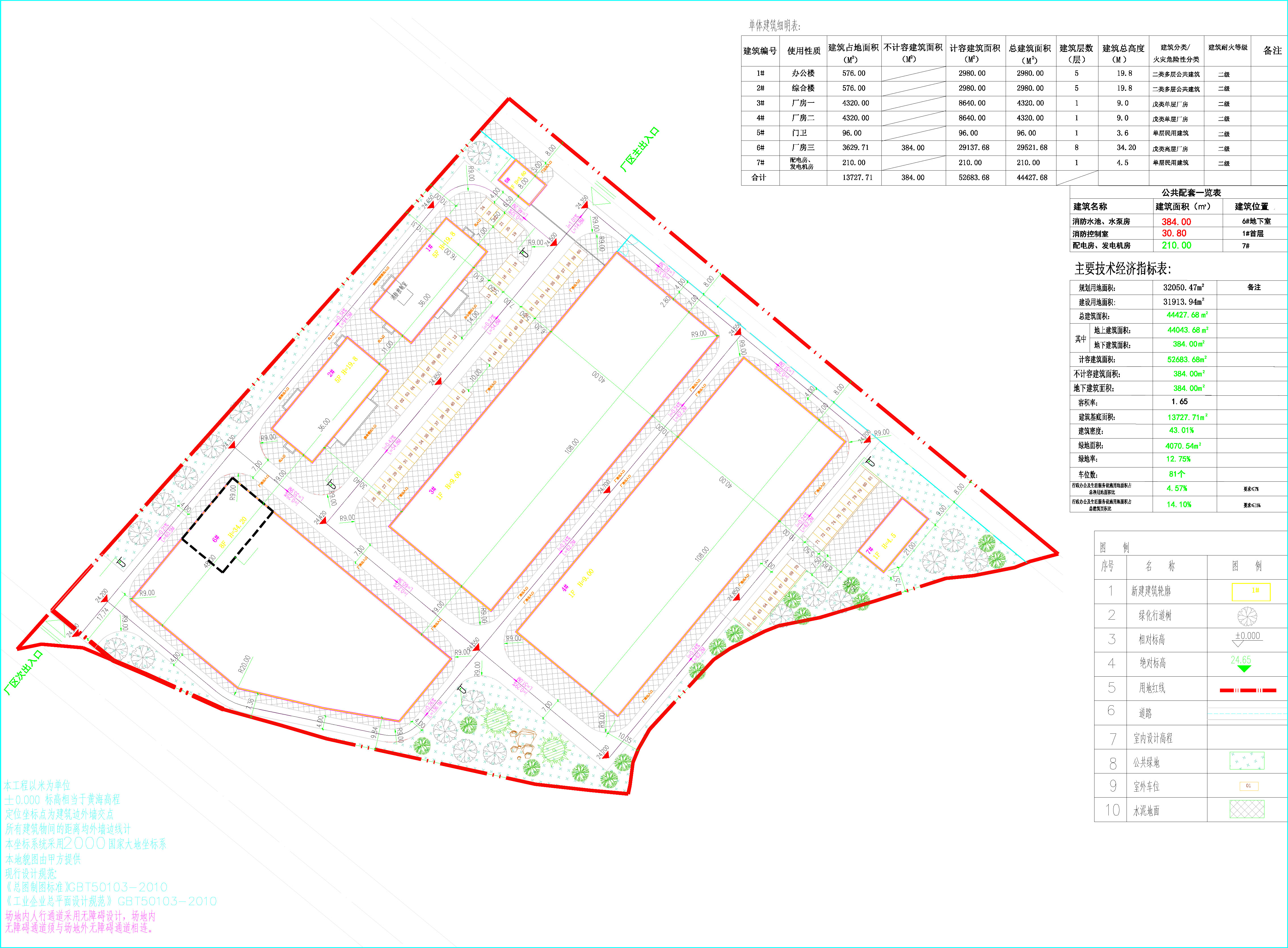 廣東洪盛利五金科技股份有限公司項目總平面方案:總用地面積32050.47平方米,規(guī)劃建設用地面積31913.94平方米,城市道路面積136.53平方米,建筑基地面積13727.71平方米,總建筑面積44427.68平方米,總計容建筑面積52683.68平方米,不計容面積384平方米,容積率1.65,建筑密度43.01%,綠地率12.75%,地上建筑高度34.2米,地下建筑深度4米。