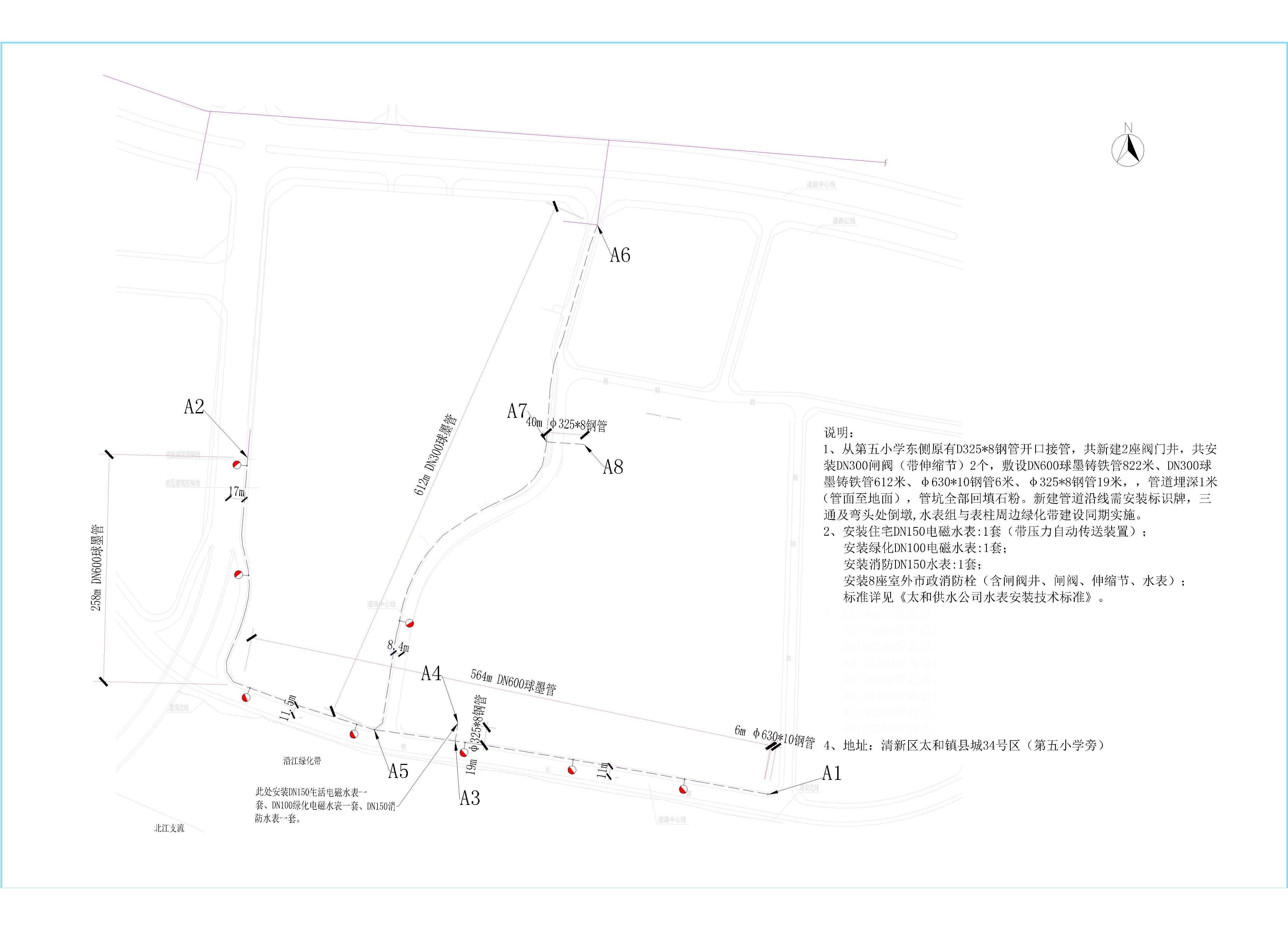 報(bào)來(lái)給水管線,敷設(shè)總長(zhǎng)度1499米。從第五小學(xué)東側(cè)原有D325*8鋼管開口接管40米,共新建2座閥門井,共安裝DN300閘閥(帶伸縮節(jié))2個(gè),敷設(shè)DN600球墨鑄鐵管822米、DN300球墨鑄鐵管612米、φ630*10鋼管6米、φ325*8鋼管19米,,管道埋深1米(管面至地面)。