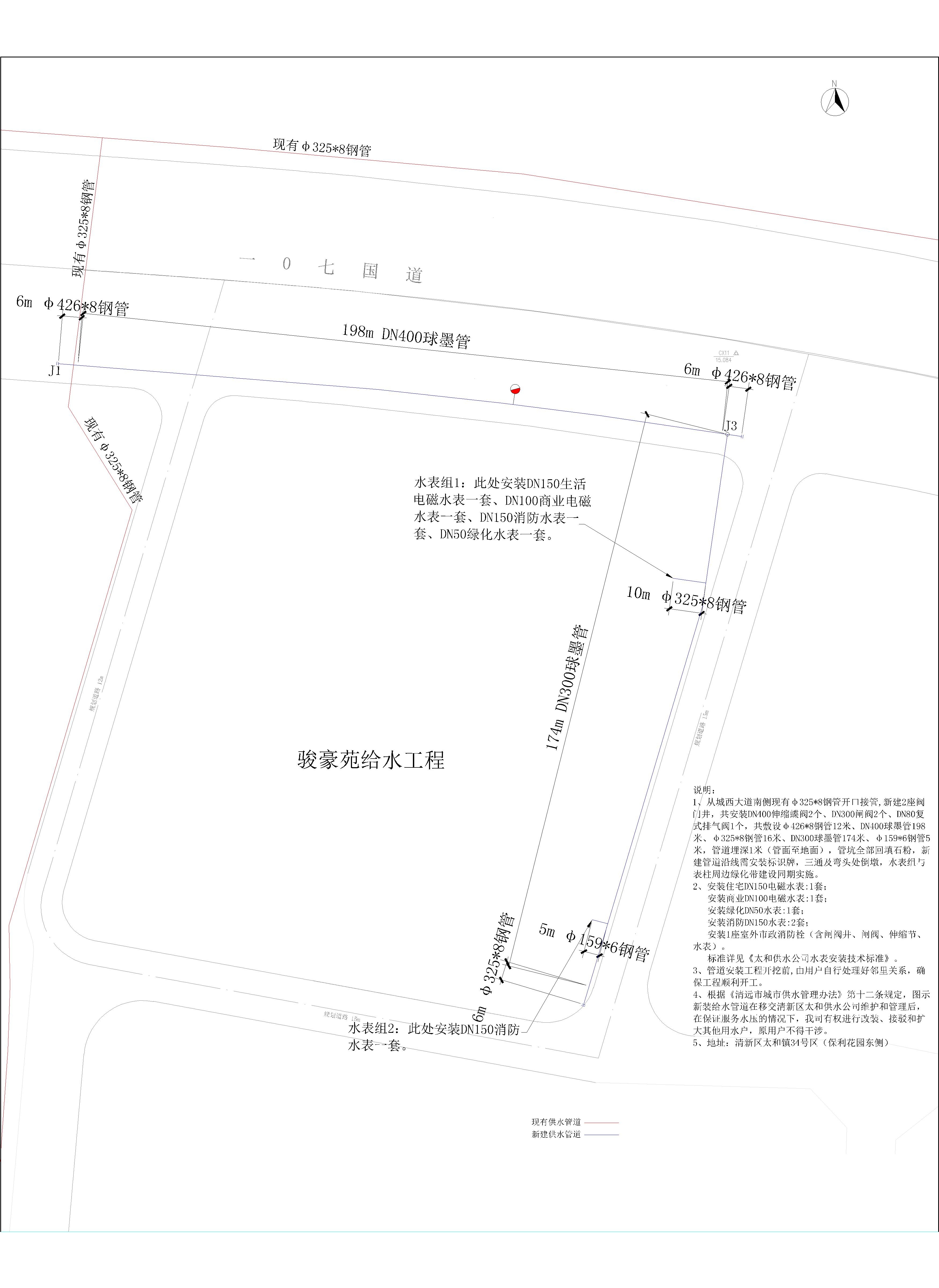 現(xiàn)報來項目位于清新區(qū)太和鎮(zhèn)縣城三十四號區(qū),從城西大道南側現(xiàn)有φ325*8鋼管開口接管,新建2座閥門井,共安裝DN400伸縮蝶閥2個、DN300閘閥2個、DN80復式排氣閥1個,共敷設φ426*8鋼管12米、DN400球墨管198米、φ325*8鋼管16米、DN300球墨管174米、φ159*6鋼管5米,管道埋深1米(管面至地面),管坑全部回填石粉,新建管道沿線需安裝標識牌,三通及彎頭處倒墩,水表組與表柱周邊綠化帶建設同期實施。