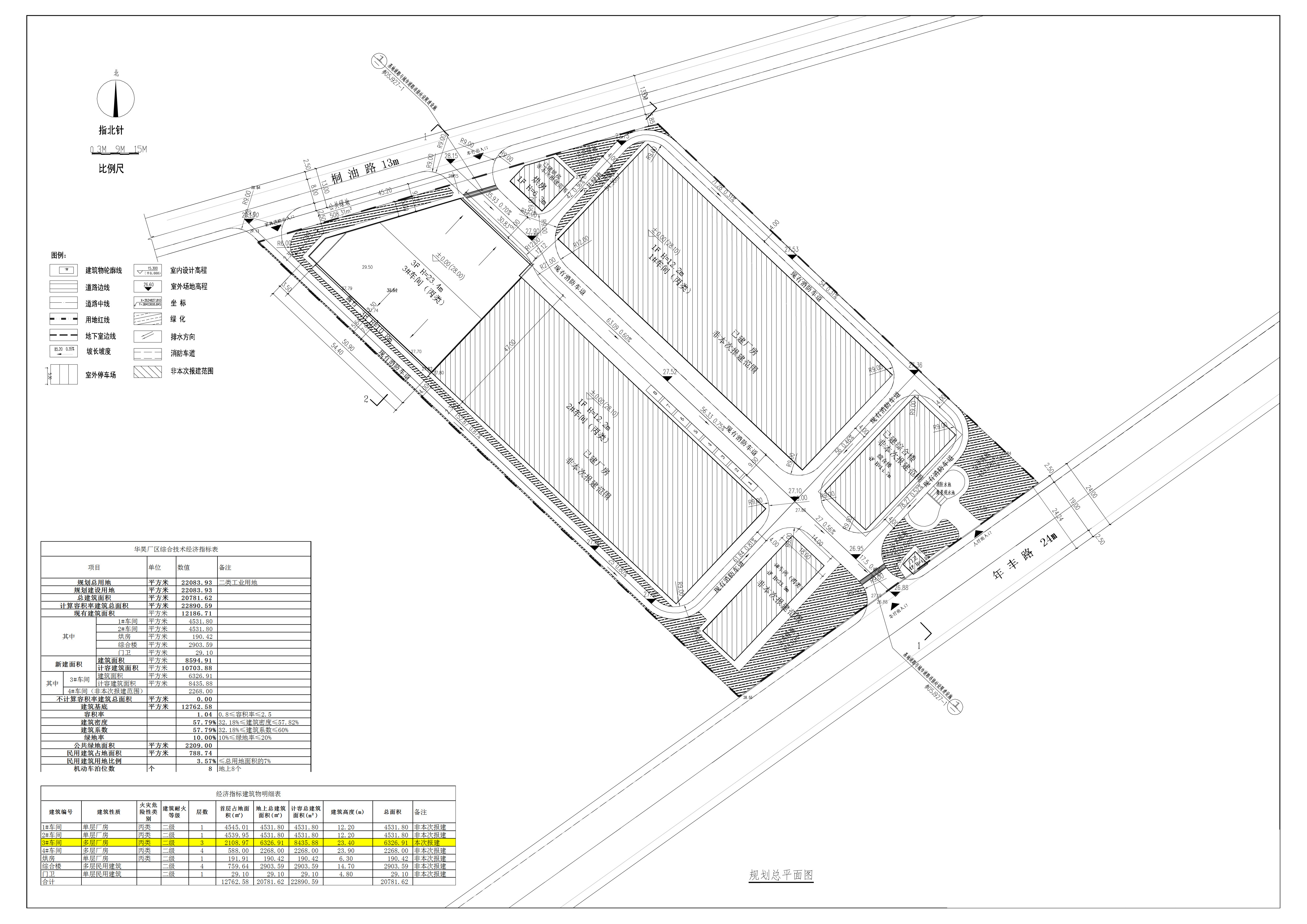 現報來總平面設計方案指標為:總用地面積22083.93平方米,總建筑面積20781.62平方米,建筑基底面積12762.58平方米,建筑密度57.79%,計容建筑面積22890.59平方米,容積率1.04,綠地率10%,綠地面積2209平方米,地上最高建筑高度23.9米,行政辦公及生活配套設施用地占地面積788.74平方米,所占比例3.57%,標準小車停車位8個。地上布置4棟車間,一棟烘房,一棟綜合樓,一間門衛(wèi)室;報來的3#車間設計方案指標為:建筑占地面積2108.97平方米,總建筑面積6326.91平方米,總計容建筑面積8435.88平方米,地上建筑高度23.4米,建筑層數3層,首層層高5.7米,二層5米,三層12米。