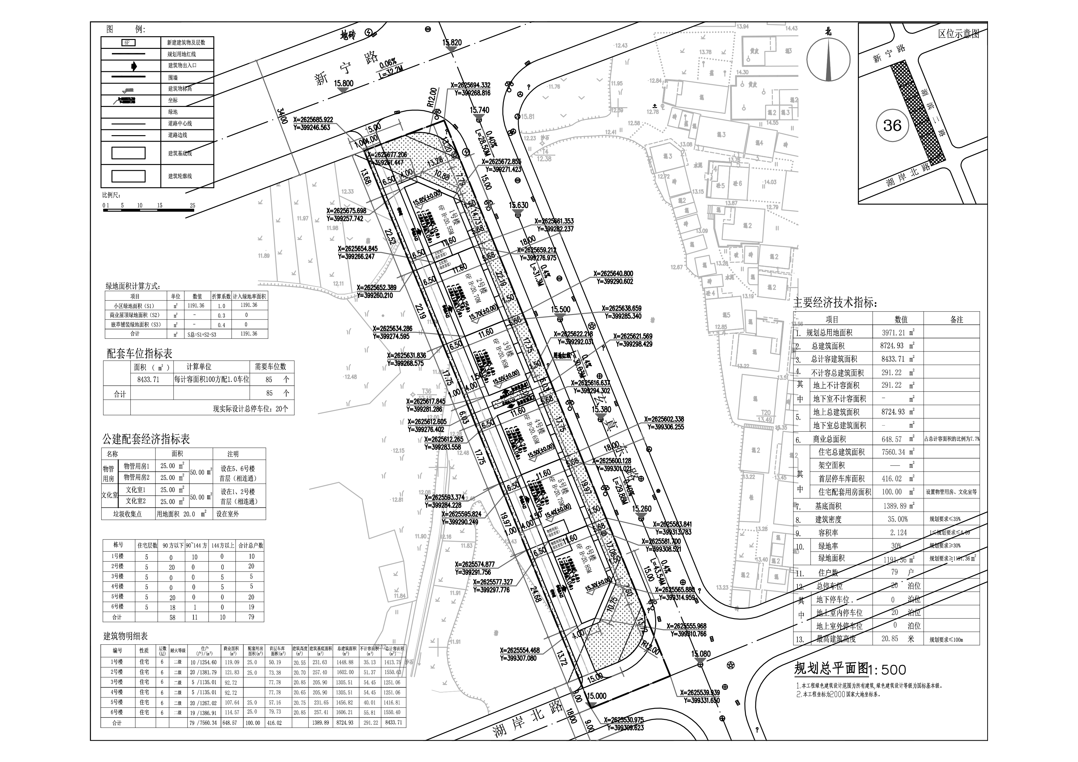 現(xiàn)報來規(guī)劃總平面方案指標為:規(guī)劃總用地3971.21㎡,總建筑面積8724.93㎡,總計容面積8433.71㎡(商業(yè)648.57㎡,住宅7560.34㎡,停車416.02㎡,配套用房100㎡),不計容面積291.22㎡,基底面積1389.89㎡,建筑密度35%,容積率2.124%,綠地率30%,綠地面積1191.36㎡,住戶79戶。配套文化室50㎡,物管50㎡,垃圾收集點20㎡,地上6棟住宅,建筑高度20.85m。