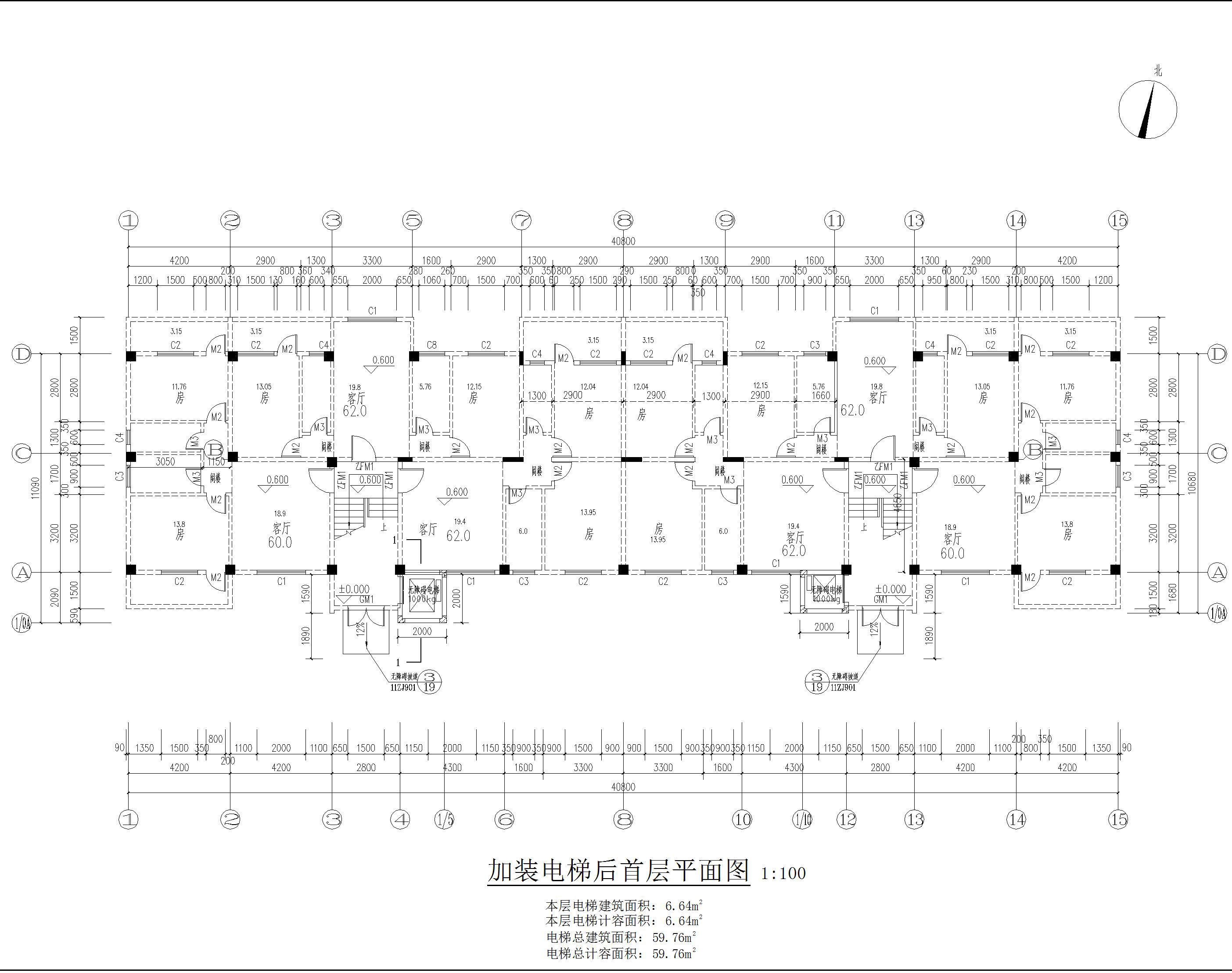 報來住宅樓加裝電梯工程設計方案,擬在原建筑南側(cè)兩個樓梯間一側(cè)各加裝一臺曳引式無機房電梯,尺寸為2米*2米及1.59米*2米,電梯出入口位于樓梯間內(nèi),電梯層數(shù)9層,高度28.1米,首層平臺高2.6米,其余層高3米,分別在1~8層樓梯間半層平臺開設電梯出入口,屋面層無出入口,兩個電梯合計基底面積6.64平方米,合計建筑面積59.76平方米。