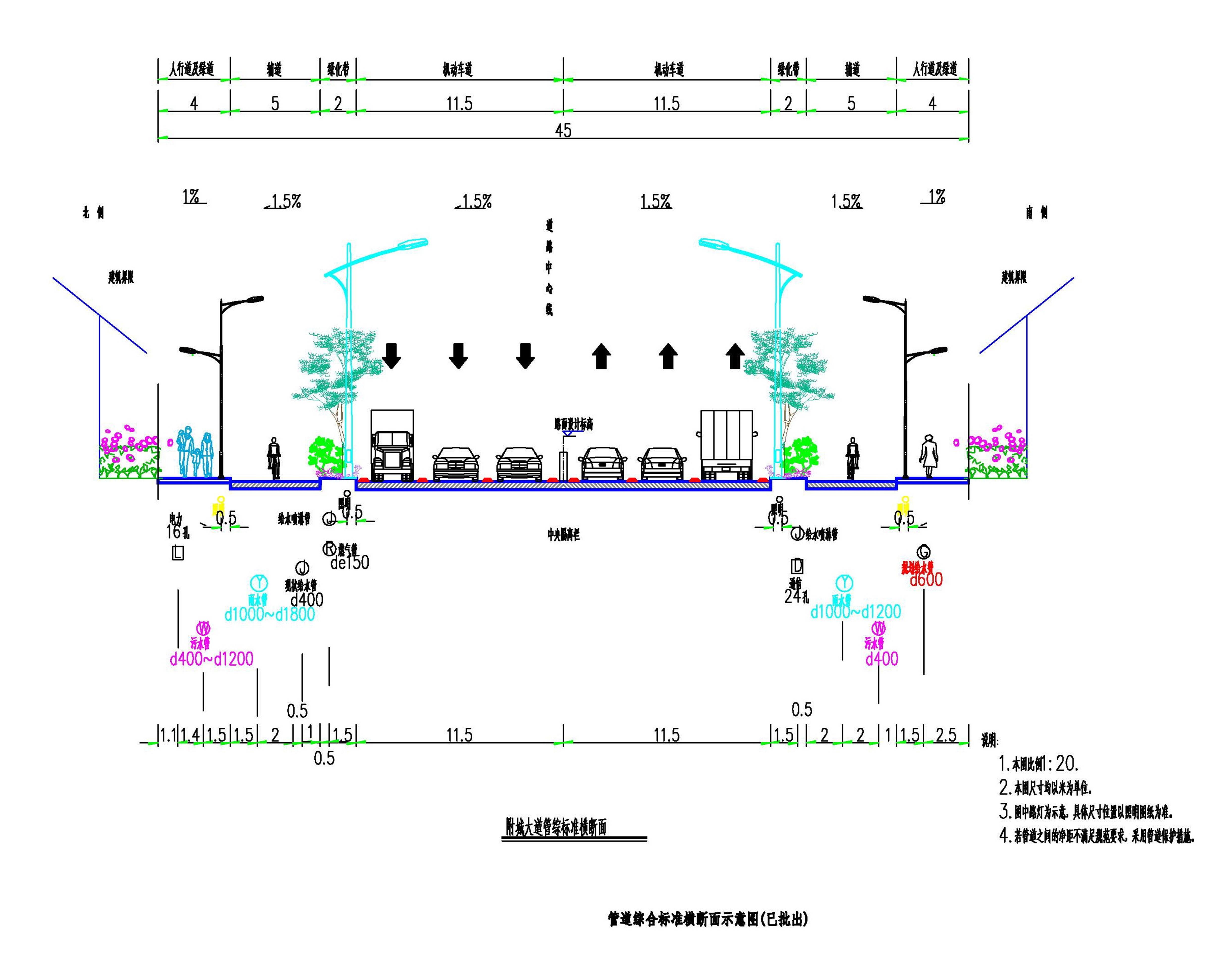 建設(shè)單位報來清遠(yuǎn)市附城大道(明霞大道至鳳翔北路)改造提升工程方案修改,主要修改內(nèi)容:1、因旅安橋增寬人行橋面,發(fā)現(xiàn)北側(cè)新增人行橋與一現(xiàn)狀燃?xì)夤軟_突,本方案將原燃?xì)夤芟虮眰?cè)遷移10米。2、因避免遷移城市綠化喬木,將原道路橫斷面綠化帶由2米增加至4米,壓縮輔道至3米,同時將道路兩側(cè)雨污水管分別往外側(cè)偏移,避免排水管道溝槽開挖對現(xiàn)狀綠化喬木的影響。3、考慮到遠(yuǎn)期開發(fā)可能性,重新調(diào)整部分管道管徑。詳細(xì)情況見附圖。4、擬修改后的方案:起點位于現(xiàn)狀明霞大道,終點到達(dá)風(fēng)翔北路,全長約3435.14m,規(guī)劃紅線寬度為45m。雙向六車道,道路主線橫斷面布置為:4m(人行道及綠道)+3m(輔道)+4m(側(cè)綠帶)+23m(車行道)+4m(側(cè)綠帶)+3m(輔道)+4m(人行道及綠道)。