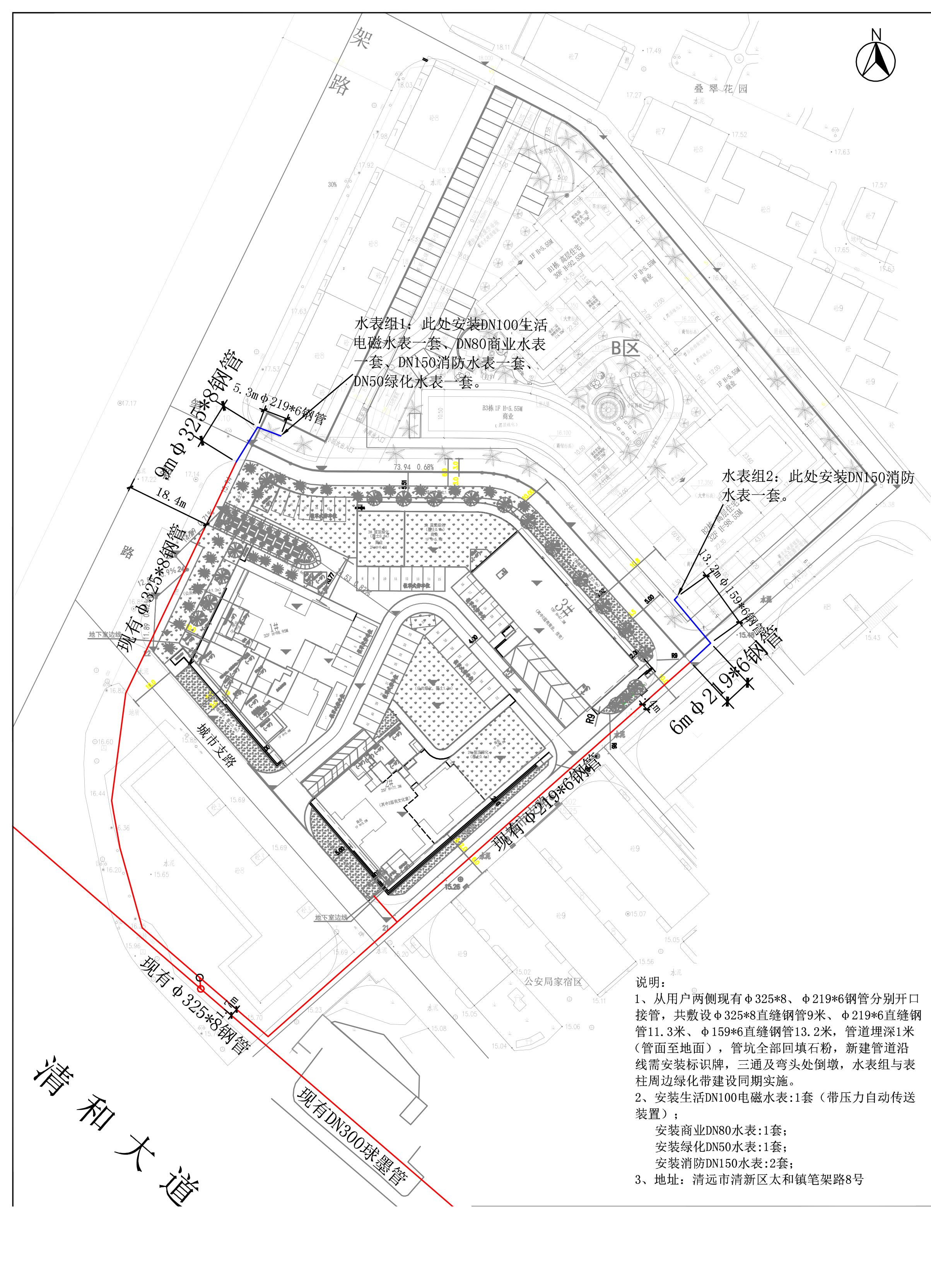 現(xiàn)報(bào)來啟創(chuàng)華府給水工程方案調(diào)整,根據(jù)現(xiàn)場(chǎng)情況調(diào)整內(nèi)容如下:φ325*8、φ219*6鋼管分別開口接管,共敷設(shè)原φ325*8直縫鋼管6米修改為9米、原φ219*6直縫鋼管18米修改為11.3米、原φ159*6直縫鋼管13米修改為13.2米,其余不變。