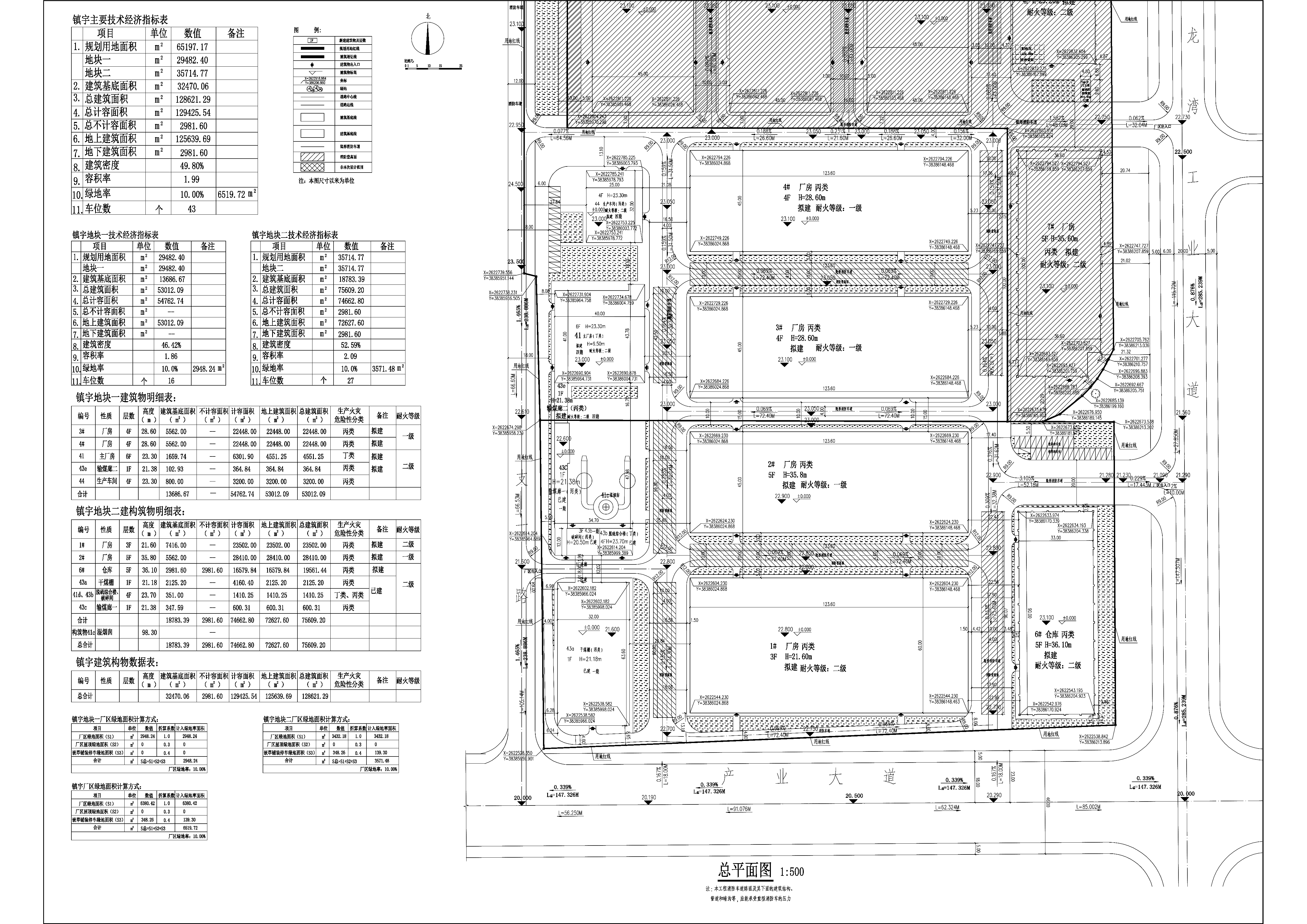 現(xiàn)報(bào)來總平面修改方案,修改內(nèi)容為:原2#倉庫與延時(shí)曝氣池修改為2#廠房,層數(shù)由2層改為5層;原4#倉庫修改為1#廠房,層數(shù)由1層改為3層;原3a#生產(chǎn)車間a、3b#生產(chǎn)車間b、3c#生產(chǎn)車間c、3d#生產(chǎn)車間d四棟單層單體改為3號廠房和4號廠房兩棟四層高單體;6#倉庫單體增加夾層設(shè)計(jì)。 修改后總平面指標(biāo)為:總用地面積65197.17平方米,總建筑面積128621.29平方米,總計(jì)容面積129425.54平方米,基底面積32470.06平方米,容積率1.99,建筑密度49.80%,綠地面積6519.72平方米,綠地率10.00%,建筑高度36.10米。詳見附圖,最終以批出為準(zhǔn)。
