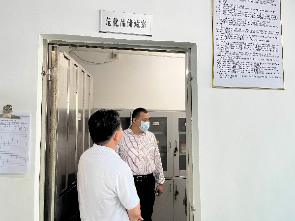 檢查組先后檢查了辦公大樓、實驗室、倉庫等區(qū)域,仔細排查了英德市環(huán)境監(jiān)測站?;穬Σ厥摇⒒炇?、危廢儲存間等重點場所的安全隱患。