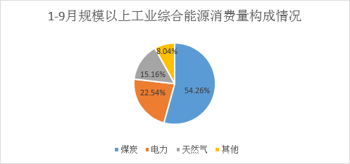 煤炭在全市能源消費(fèi)比重占有重要地位,然后依次是電力、天然氣等能源品種。今年1-9月,規(guī)模以上工業(yè)煤炭消費(fèi)277.87萬(wàn)噸,折標(biāo)量占規(guī)模以上工業(yè)綜合能源消費(fèi)量比重為54.26%,較上年下降了10.78個(gè)百分比;電力消費(fèi)占比下降了0.44個(gè)百分比;天然氣消費(fèi)占比提高了8.11個(gè)百分比;其他能源品種提高了3.1個(gè)百分比。